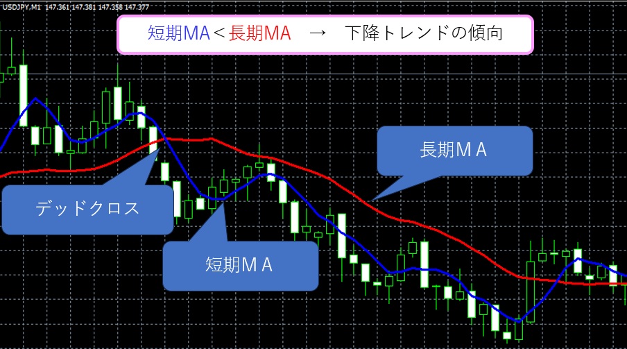 - 短期MAが長期MAを上から下に抜ける「デッドクロス」は、下降トレンドの可能性を示唆します。