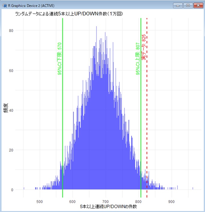 実データでの5本以上連続件数は 825件 となり、ランダムデータ1万回シミュレーションによる95%信頼区間(570~807件)を上回りました。