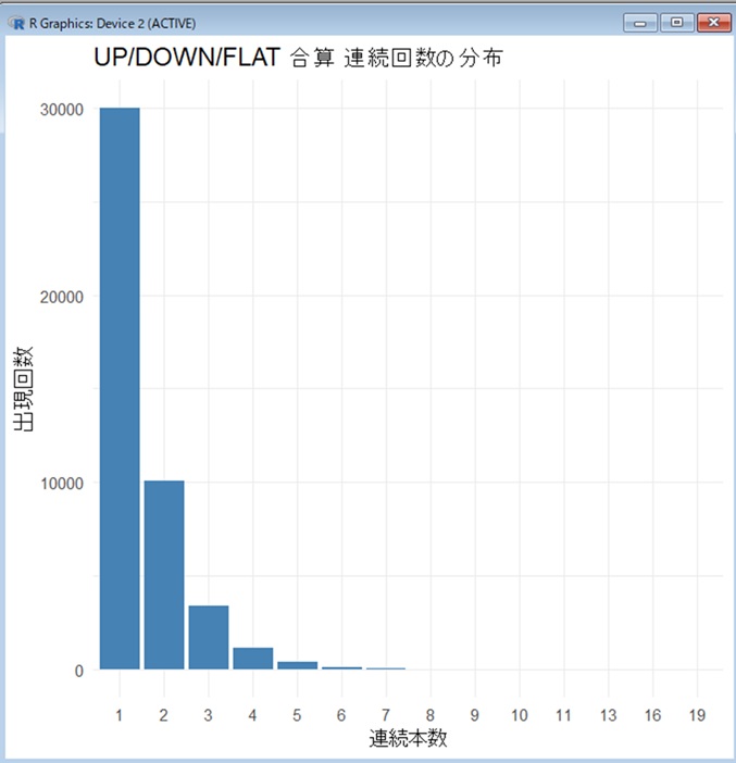 以下のグラフは、UP、DOWN、FLATの連続数を横軸、件数を縦軸にしたヒストグラムです。