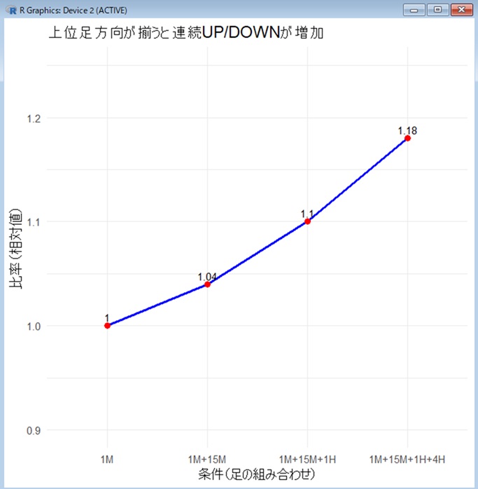 この結果は、1分足単独よりも上位足の条件を加えたマルチタイムフレーム分析において、短期的なダマシが減少する傾向が統計的に確認できたことを示しています。実務的には、上位足のトレンド確認が有効であることを裏付けます。