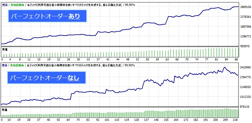 パーフェクトオーダーを導入した場合、チャートは滑らかに右肩上がりとなり、損失トレードが減少しました。