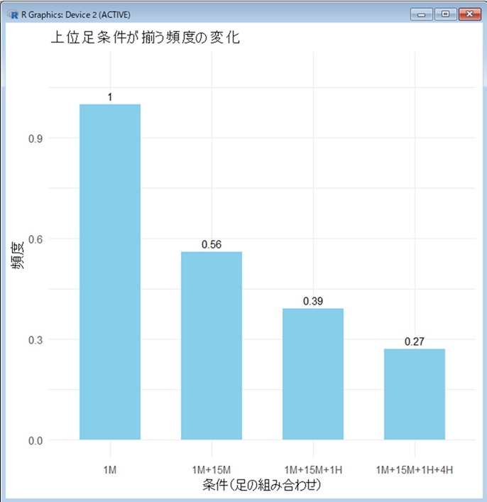 なお、時間足の条件を一つ加えるごとに該当する件数は下記の通り当然のことながら減っていきます。