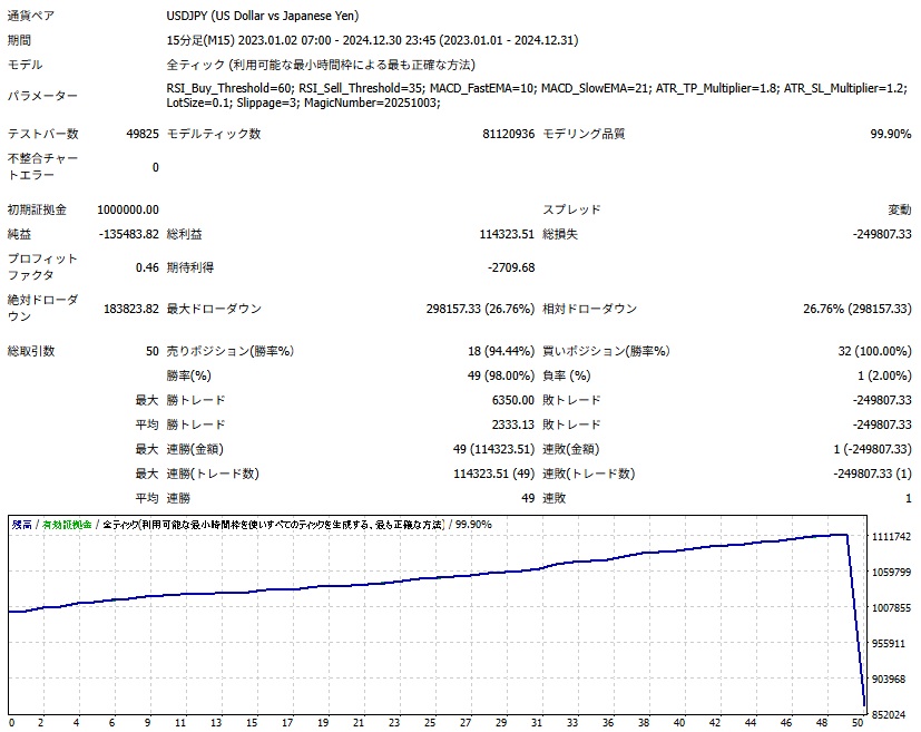 プロンプトを使って作成したEAのバックテストの結果です。