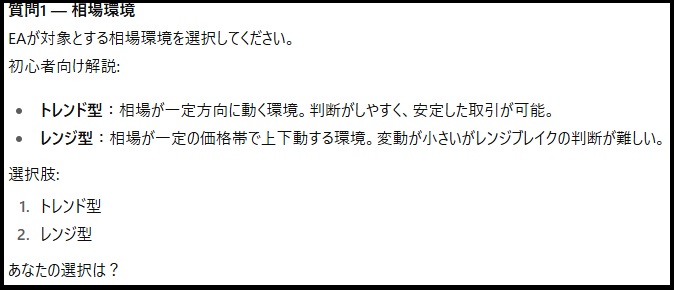 プロンプトは「質問形式」で進むため、EAの仕様決定がスムーズです。