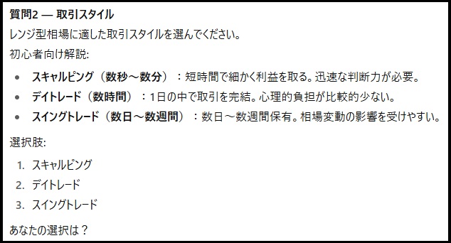 相場環境や取引スタイル、通貨ペア、エントリー・エグジット条件など、初心者でも迷わず答えられるように設計されています。