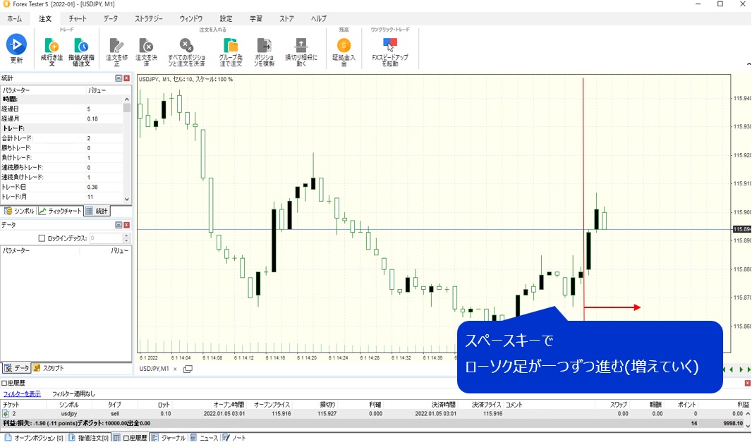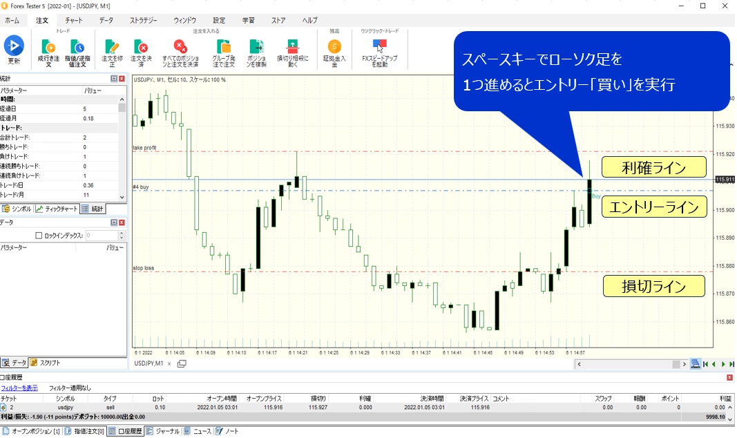 ⑥スペースキーでローソク足を1つ進めるとエントリー「買い」を実行