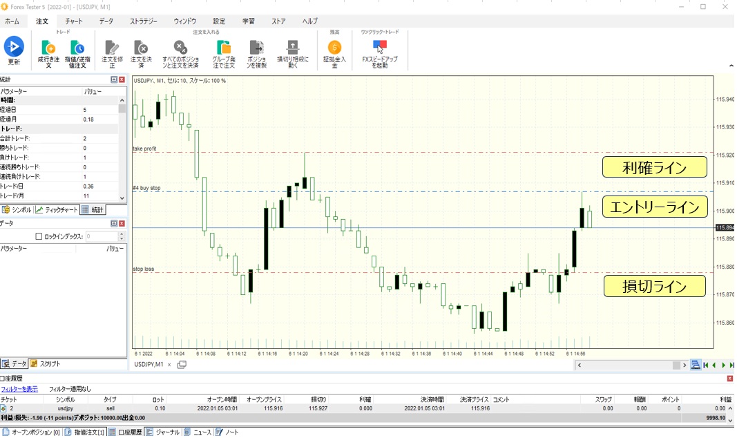 フォレックステスター(Forex Tester)を使ったトレードのイメージです。(Forex Tester5の画面となります)