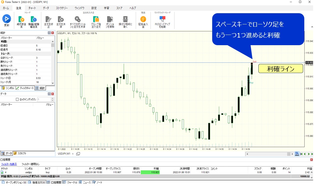 ⓻スペースキーでローソク足をもう一つ1つ進めると利確