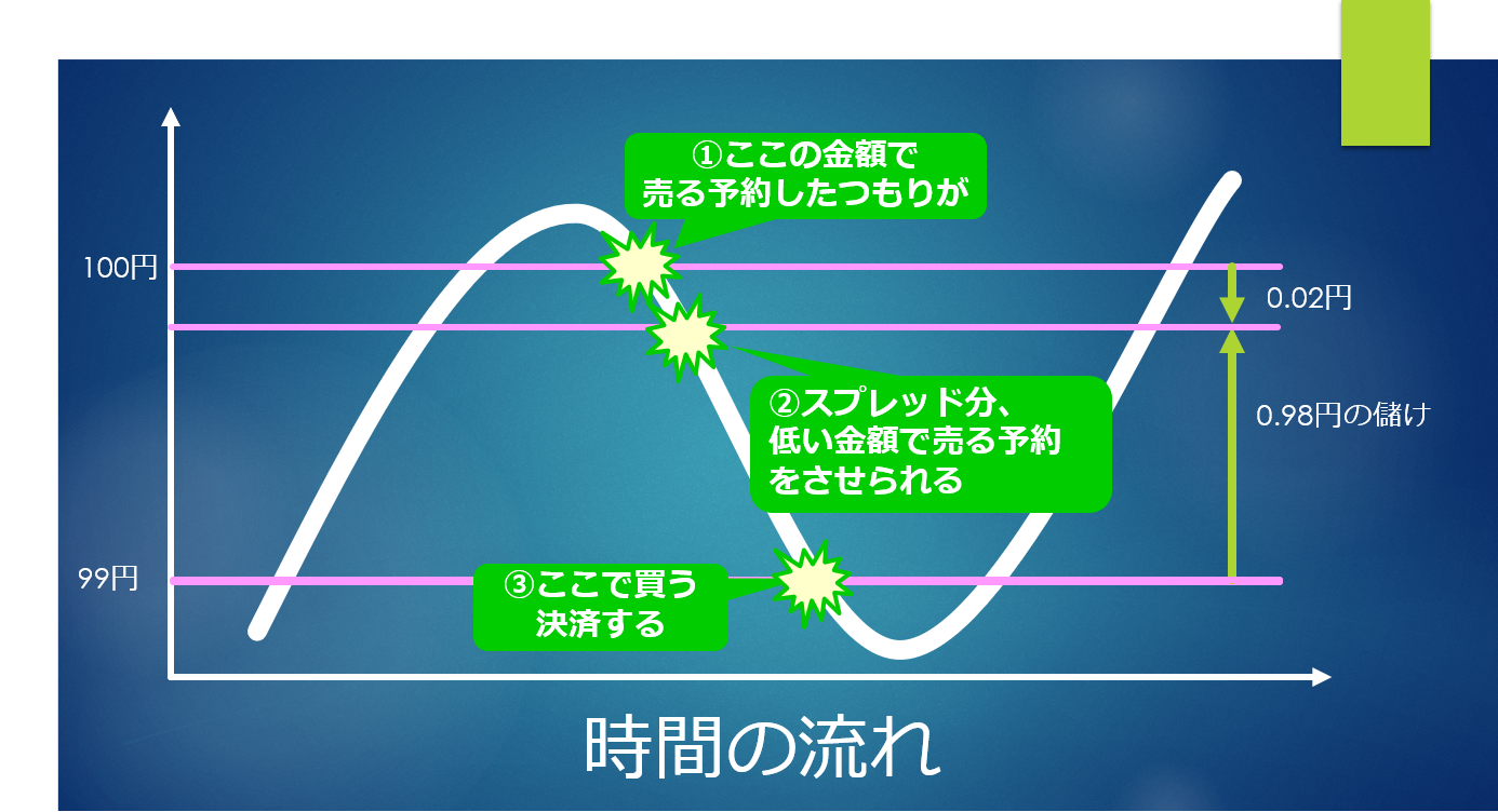 スプレッドは、下記の図のように例えば、売る予定の価格から実際に売った価格にズレが生じる、このズレの幅のことです。