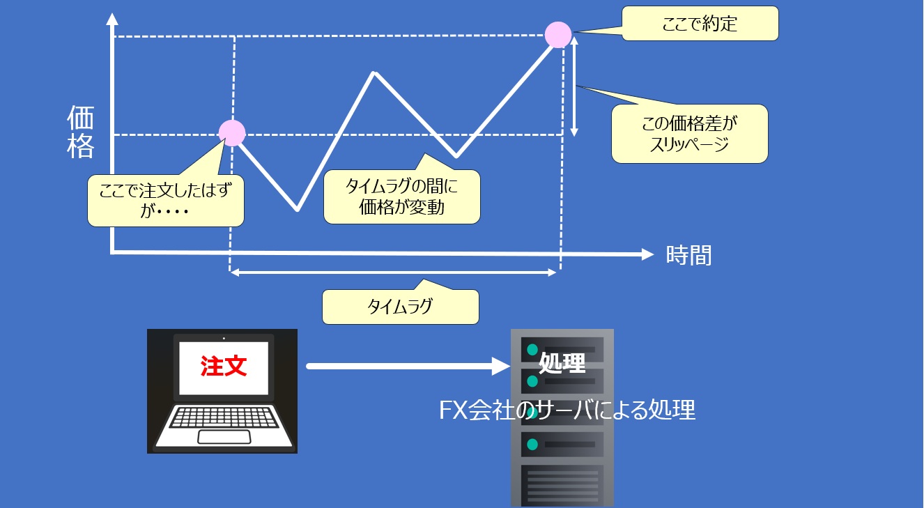 スリッページは「注文した時点から料理が出てくる時点までのタイムラグの間に値段が変わってしまうこと」です。
