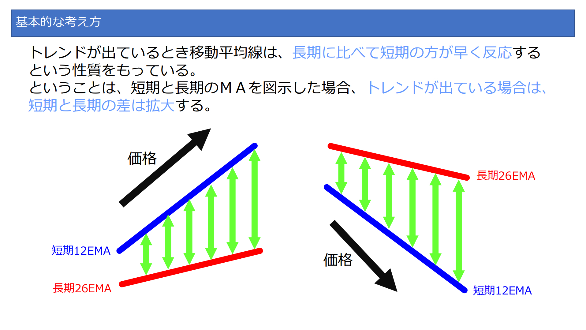 これは、短期EMAが価格変動をより早く反映し、長期EMAよりも先に勾配が変化するためです。