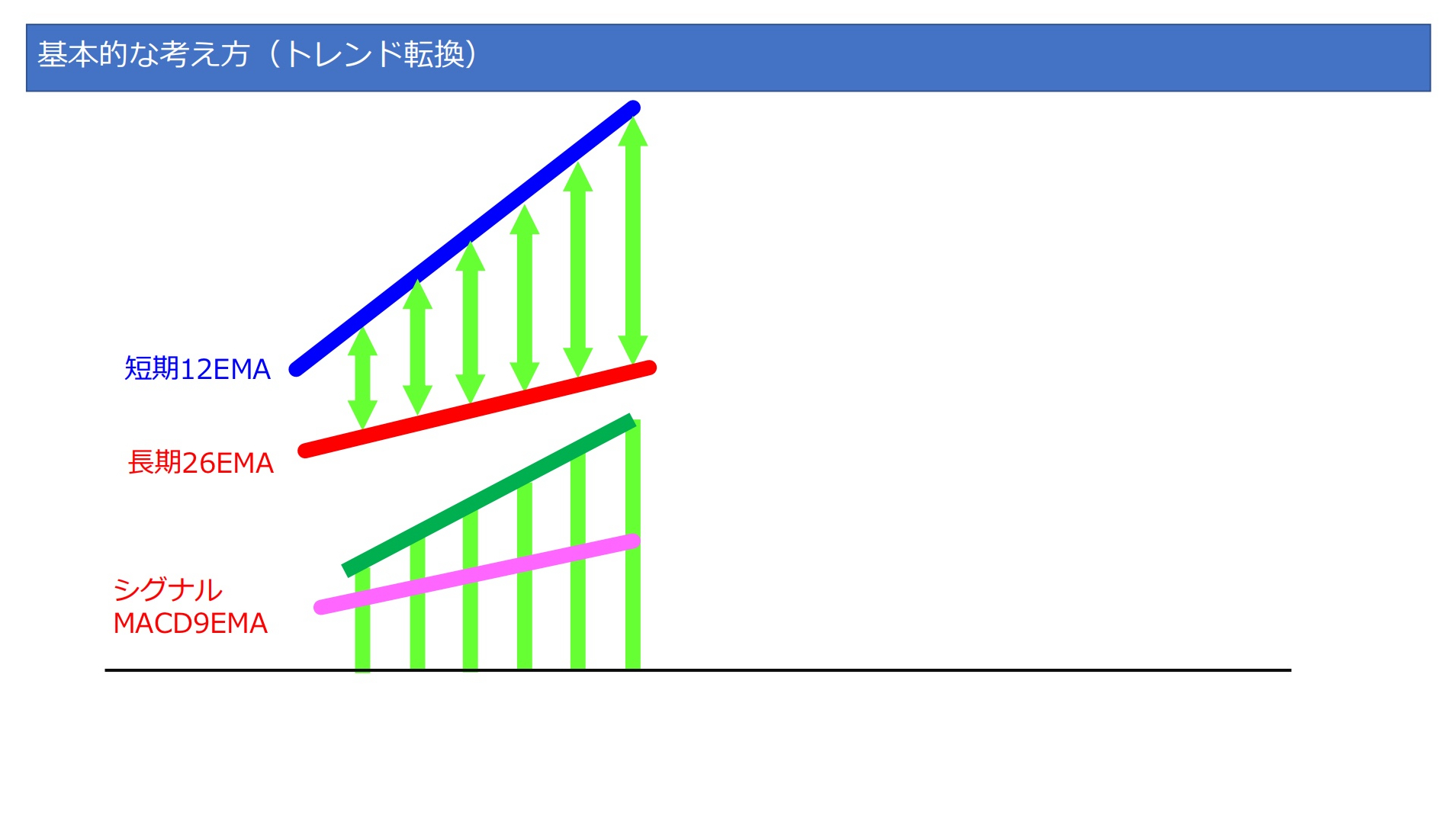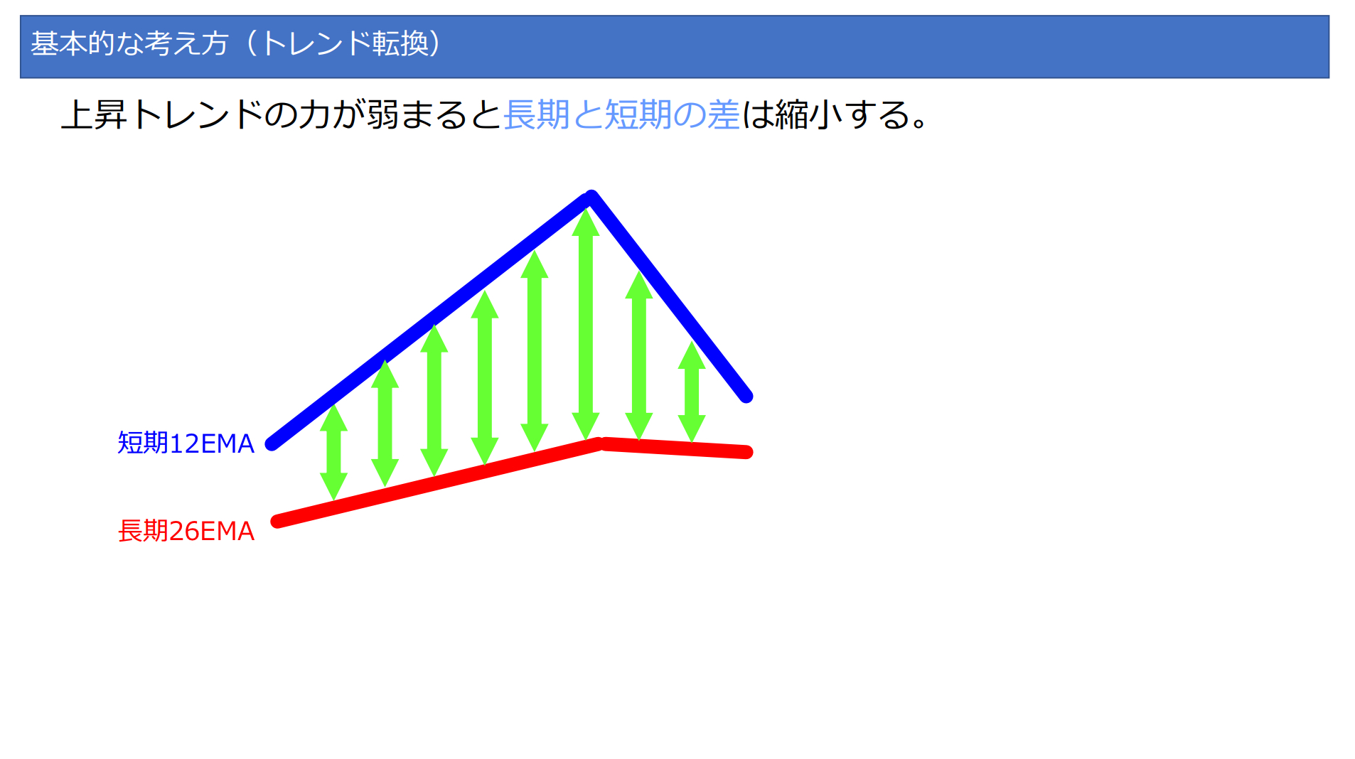 上昇、下降トレンドの勢いが弱まると12EMA - 26EMAの差は小さくなります。