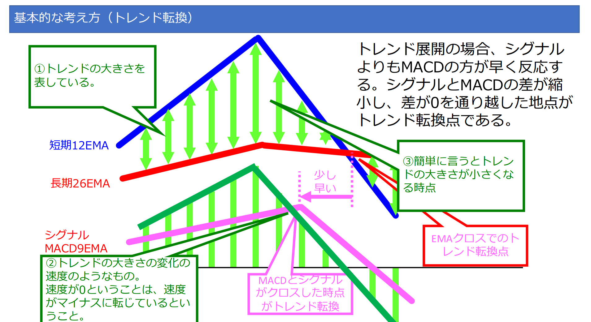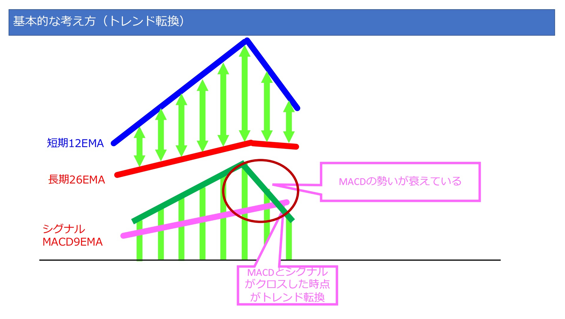 今の加速度(MACD)が平均加速度(シグナル)より大きければ、車は加速中であり、逆に小さければ減速中と見ることができます。