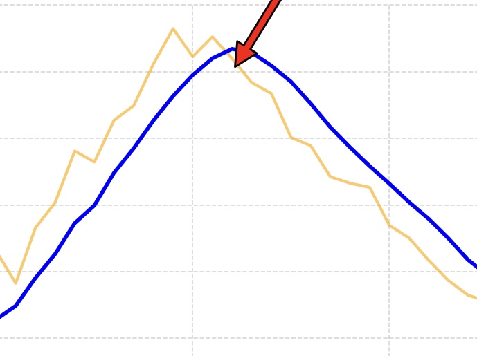 ゴールデンクロス、デッドクロスは、「MAについて」で説明したEMAの山の頂上(26EMAの頂上)、つまり勾配が水平になる点よりも、早く検出できます。